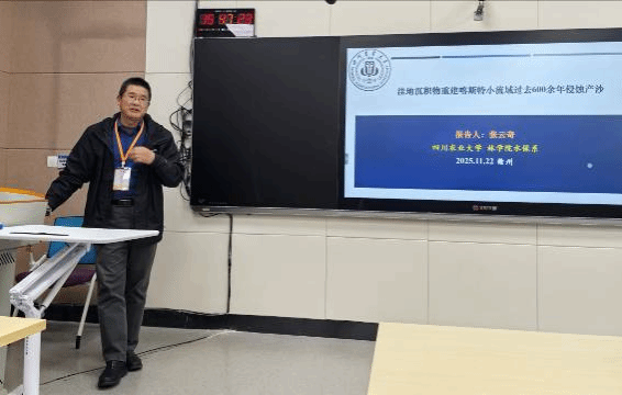 大会共设立7个分论坛,议题涵盖山地自然资源与生态安全、气候变化与灾害风险应对、陆表监测技术与信息集成、山地智慧农业与乡村振兴、山区差异与绿色转型等多个前沿方向。重点实验室张云奇教授受邀主持“山地自然资源与生态安全”分会场,并在该环节作题为“洼地沉积物重建喀斯特小流域过去600余年侵蚀产沙”的学术报告,展示了实验室在山地环境与侵蚀过程研究方面的最新进展,引起了与会专家的广泛关注与讨论。
