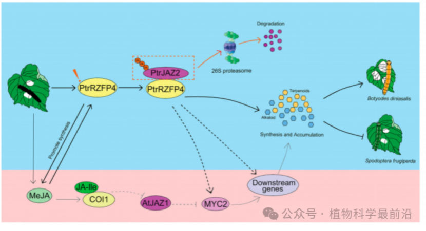 该项研究不仅发现了一个全新的JA信号正调控因子,更重要的是揭示了植物如何利用PtrRZFP4-PtrJAZ2分子模块,实现对不同食性昆虫的"精准防御"策略。