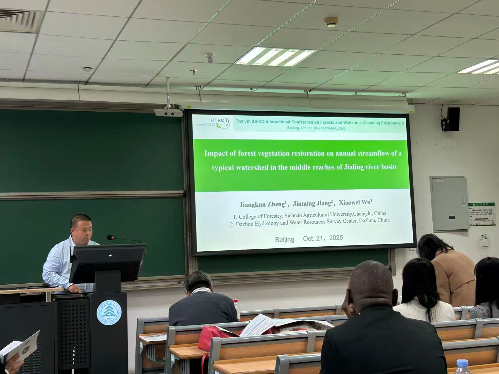 会议设置了主题报告、分会场专题论坛,就“森林水文服务稳定性的维持机制与提升路径”“人工林生态水文效应与多尺度响应”和“林水资源协同管理和气候变化适应机制”等关键问题进行专题研讨。重点实验室郑江坤副教授在分会场做了题为“Impact of forest vegetation restoration on annual streamflow of a typical watershed in the middle reaches of Jialing river basin”(森林植被恢复对嘉陵江中游典型流域年径流的影响)学术报告。